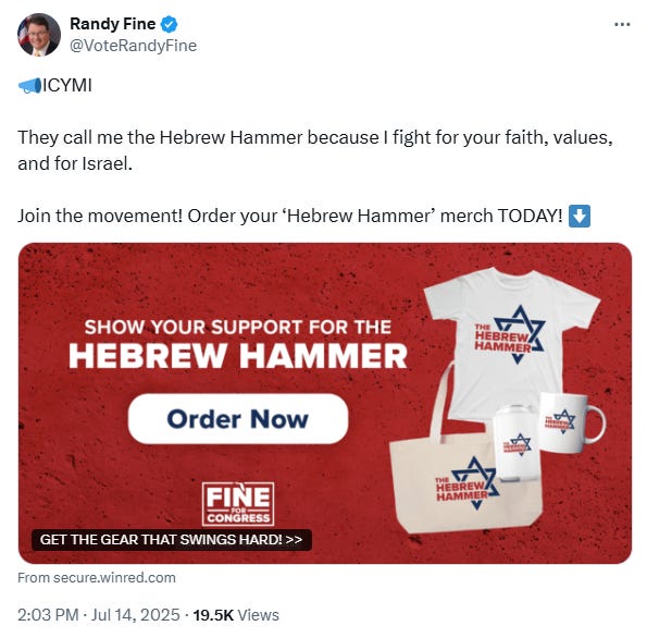 On November 26th, 2024 Randy Fine tweeted that he, the “Hebrew Hammer” was coming to congress and that the two Muslim congresswomen should “consider leaving before I get there”. (Reading this as any kind of threat, which some Islamic advocacy groups attempted to do, is obviously absurd. It does, however, demonstrate a specific ethnic/religious conflict among members of the U.S. congress).